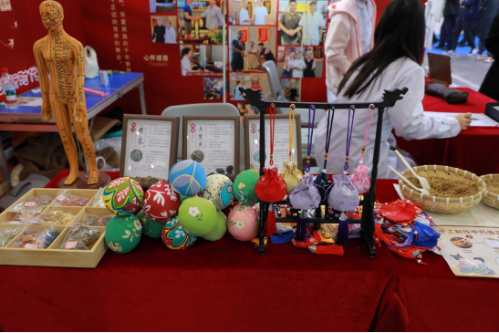 展区另一侧的产品陈列区,各类中医特色物品整齐摆放,吸引不少人驻足观看,艾草锤、各式草本香囊等文创产品兼具实用性与文化感,免费供应的定制中药茶饮更是香气四溢,吸引大批观众驻足体验、咨询交流,现场互动氛围热烈。现场服务不仅让大家近距离体验到中医的便捷与实用,更让传统中医智慧以更贴近生活的方式触达大众。